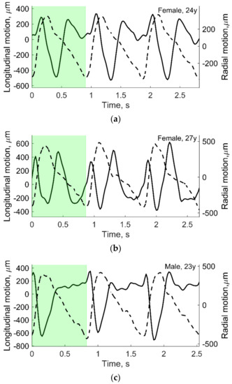 The processed in vivo radial (dashed line) and longitudinal (solid line) motions of CCA in three young subjects: (a) 24 year old female; (b) 27 year old female; (c) 23 year old male. Preselected periods (green shadowed area) were used to model artery and tissue motion. Adopted from [25].