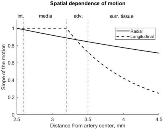 The limitation of this study comes from deficient knowledge about the in vivo slope of the longitudinal and radial motion deep into the tissue that are used as input of the model. For this moment, the slope is described by an exponential function, with parameters that were chosen according to a ratio of b1 and b2 by Stoitsis et al. [23]. Cinthio [37] evaluated such exponential function parameters from in vivo data but in a limited study and only from a healthy subject. For a more accurate evaluation of slope, the artery diameter could also be considered, since for illustrative purposes, we modeled CCA with a narrow diameter of 5 mm from those observed in the population [25,26], and it is expected that with a higher diameter, the slope will be lower. With aging, arterial stiffness increases [31], so motion slope should be evaluated not only in healthy but also in atherosclerotic patients to model different arterial stiffness. Tissue is complex anisotropic [44], viscoelastic nonlinear, nonhomogeneous media and those features were not modeled here.
