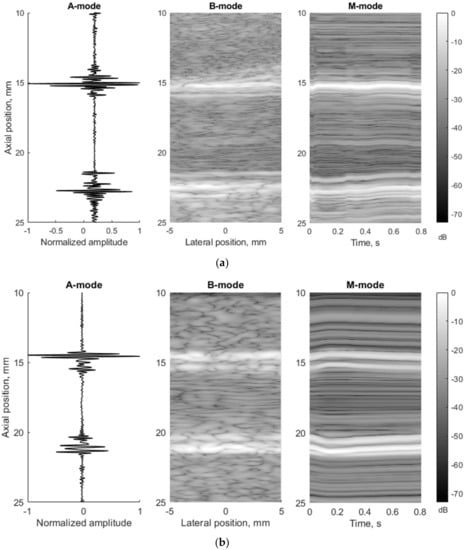To compare in vivo US data and in silico model data in more detail, they were presented in three different ultrasound modes: A, B, and M. Comparing the experimental and modeled data, it was found that in the A-mode the echoes from the lumen-intima and media-adventitia model boundaries are clearly visible in both cases (see Figure 8, A-mode subplots). In B-mode cases, the model walls are visible as a double-line pattern. Thus, the 3D model represents a structure similar to in vivo arterial walls (see Figure 8a,b).
