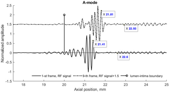 Arterial stiffness is an independent predictor of cardiovascular events, and it is analyzed to assess cardiovascular risk [11,12,13]. Within the context of CVD risk assessment, the motion of arterial tissues during the cardiac cycle is important, as mechanical deformation represents vessel elasticity and is putatively inversely related to arterial stiffness, an independent indicator of all-cause mortality and morbidity [14]. Arterial tissue motion during the cardiac cycle consists of radial (artery wall motion perpendicular to blood flow), longitudinal (intima–media complex motion in parallel with blood flow) motions, and circumferential strain. Using several techniques, the motion of the arterial tissue from sequences of ultrasound (US) radiofrequency (RF) signals or images has been analyzed [15].