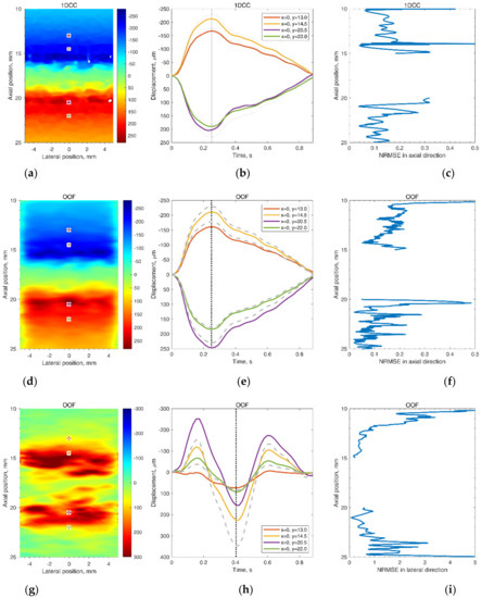 Frozen frames and selected point waveforms of radial (a,b,d,e) and longitudinal (g,h) movement in the scanning plane (a,d,g) in time at four selected points (b,e,h) and motion detection normalized root mean square error (NRMSE) in the midline of the scanning plane (c,f,i). Displacement magnitudes in the scanning plane (a,d,g) are at the moments (0.25 and 0.4 s) of maximal defined displacement that correspond to the vertical lines in the motion evolution over time in (b,e,h), where the grey, dashed lines depict the theoretical motion, and the solid, colorful lines depict 3D motion estimated by 1DCC (b) or OOF (e,h) algorithms (the displacement amplitudes were accumulated relative to the first frame). The waveform from the 24 year old female with a peak-to-peak amplitude normalized to 0.5 mm was used as the defined displacements waveform in the model.