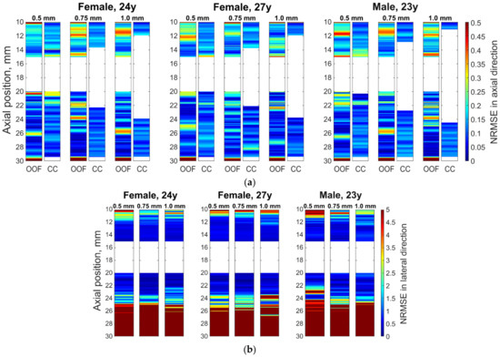 Normalized root mean square errors (NRMSEs) between theoretically defined and estimated motion in the midline of the scanning plane: (a) radial errors in the axial direction; (b) longitudinal errors in the lateral direction. (a,b) Sub-images: three blocks are the estimation errors for the model with three different defined waveforms (of 24 year old female, 27 year old female, and 23 year old male) with columns for maximal peak-to-peak amplitudes of 0.5, 0.75, and 1 mm, respectively. The motion was estimated in the axial direction by 1DCC and by OOF algorithm; motion in lateral direction by the OOF algorithm.
