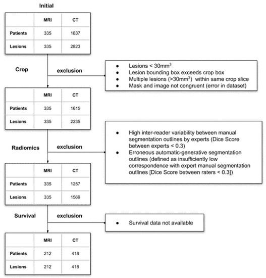 Based upon this comprehensive multimodality database, we produced an extensive analysis of inter-reader reliability in terms of ICC for each radiomic feature. Reliability analysis indicated that radiomic features were most reliably assessed individually, rather than in association with a feature group. To our knowledge, this is the first study to provide such a large-scale analysis on various tumor entities across both clinical CT and MRI datasets. Other groups have worked on smaller datasets and reported comparable results on subsets of the data when using smaller numbers of segmentation outlines [18,26,27]. For the NSCLC dataset, Kadoya et al. found a C-index of 0.625 for a multivariate radiomic feature model [28]. In contrast, Fu et al. reported a C-Index of 0.67 when applying neural networks on the BRATS dataset [29], thereby indicating that deep learning-based approaches may achieve higher C-indices. This finding is plausible as such approaches achieve better results given enough data [30], yet disallow comparisons with radiomic analyses as performed in the present study.
