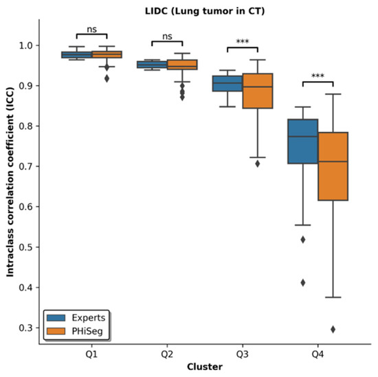 ICCs of radiomic features when calculated based on manual segmentations of lung lesions by four experts (blue) and 100 automatic-generative segmentation outlines generated by the pretrained neural network PHiSeg (orange). Features were grouped into quartiles based on manual expert segmentations and Q1 indicates the 25% most stable features, Q2 the 25–50% most stable features, Q3 the 25–50% least stable features, and Q4 the 25% least stable features. Overall, ICCs were largely similar, even though the NN introduced more variability. ns: not significant, ***: p < 0.001.