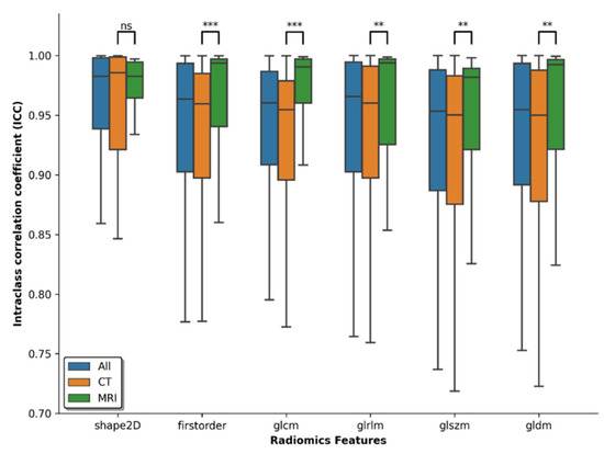 Reliability of radiomic features as a function of feature group and imaging modality. Features were grouped into shape features (“shape2D”), first-order features (“firstorder”), and gray-level matrix features, i.e., Gray Level Co-occurrence Matrix (“glcm”), Gray Level Run Length Matrix (“glrlm”), Gray Level Size Zone (“glszm”), and Gray Level Dependence Matrix (“gldm”). Imaging modalities are color-coded as follows: orange, only CT data; green, only MRI data; blue, all (CT and MRI). No consistent trends were found across the datasets, thus stressing the importance of analyzing feature reliability individually for each feature and modality. Asterisks denote statistical differences between the CT and the MRI dataset. ns: not significant, ** p < 0.01, *** p < 0.001.