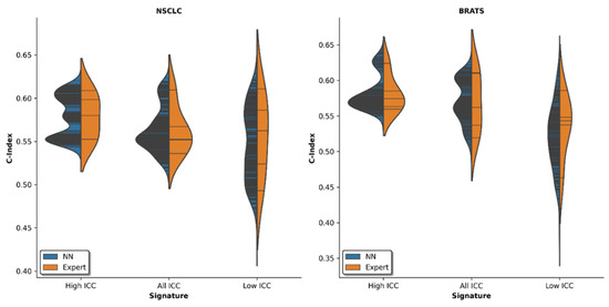 Violin plot of the Concordance indices (c-indices). Data are given as lines, while the filled curves give an estimate of the continuous probablitiy density. The violin plots indicate the predictive model’s discriminatory power as a function of ICC signature. Left: NSCLC (Non-Small Cell Lung Cancer, CT) dataset, right: BraTS (Brain Tumor Segmentation, MRI) dataset. C-indices were determined based on one manual expert and 100 automatic-generative segmentation outlines in five-fold cross-validation using a pretrained neural network (NN). The survival analysis based on only the most reliable radiomic features (as indicated by high ICCs) exhibited consistently higher mean C-indices (p < 0.001 for NSCLC and p = 0.23 for MRI) and lower variability (p = 0.06 for CT and p < 0.001 for MRI) as compared to all radiomic features or the least reliable radiomic features (p < 0.001 for NSCLC and p < 0.001 for MRI for the comparison of C-indices and p < 0.001 for NSCLC and p < 0.001 for MRI for the comparison of variability).