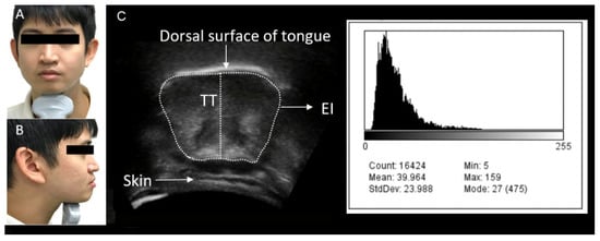 Points of measurement. (A) Position of the ultrasonography probe (anterior view). (B) Position of the ultrasonography probe (lateral view). (C) Ultrasonographic image and grayscale histogram of the tongue.