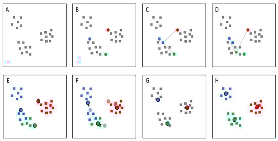 Demonstration of the K-means clustering algorithm, k = 3. (A) Data plot. (B) Three centroids are randomly created, and (C) the distance from each data-point to the centroids is calculated using Euclidean distance. (D) The step is repeated for all data-points, (E) each of which is classified into a group according to its closest centroid. (F) The centroid is updated to the new location based on the mean value of all data-points in the group. (G) The distance between each data-point and the new centroids is calculated again. (H) These steps are repeated until the mean value of all data-points stops changing.