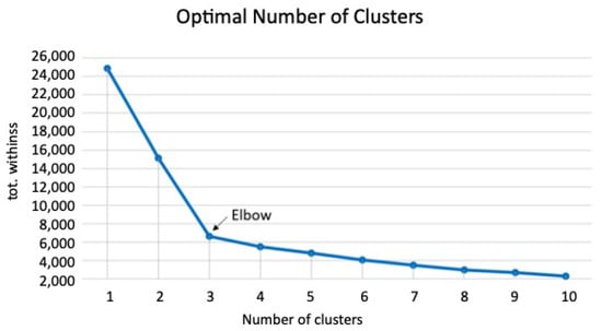 The most popular methods for determining the optimal number of clusters are the silhouette method and the elbow method—the latter of which was used in this study [21]. This method aims to minimize the sum of the square of the Euclidean distances between each point and its corresponding centroid (total intra-cluster variation, also known as total within-cluster sum of squares (tot.withinss; Equation (2)). A smaller value for tot.withinss indicates that the data-points are close to the centroid; therefore, it measures the compactness of the clustering and should ideally be as small as possible [10,20].