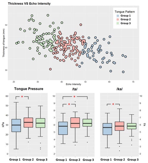 Scatter plot of echo intensity and tongue thickness using the K-means for the three groups. Box plot comparison of tongue function (tongue pressure, /ta/, and /ka/) among the groups based on tongue characteristics. Tongue pressure: Group 1 vs. Group 2, P = 0.023 (* p value < 0.05). /ta/: Group 1 vs. Group 3, P = 0.001 (* p value < 0.05); Group 1 vs. Group 2, P = 0.007 (* p value < 0.05). /ka/: Group 1 vs. Group 2, P = 0.038 (* p value < 0.05).