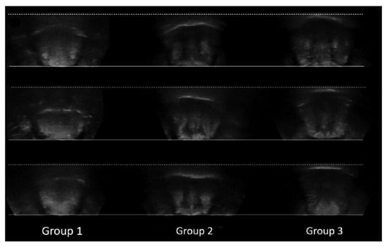 Comparison of illustrative ultrasound images in each group. The solid and dashed lines represent the lowest and the highest parts of the tongue (dorsal surface of the tongue) in Group 3, respectively.