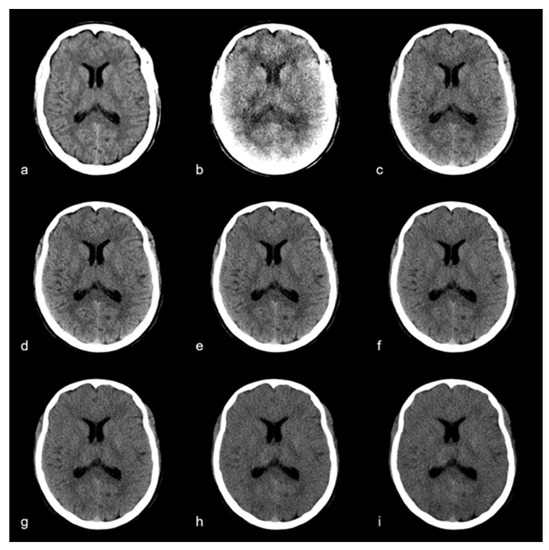 Polyenergetic reconstruction (a) and monoenergetic images at (b) 40 keV, (c) 60 keV, (d) 65 keV, (e) 70 keV, (f) 75 keV, (g) 80 keV, (h) 100 keV, (i) 120 keV. Window settings were kept equal for comparability.