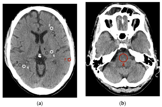 Eight different regions of interest (ROIs) were set as the basis for data collection to assess image quality (Figure 2). Six of these ROIs addressed the gray and white matter and were analogous to the methods described by Neuhaus et al. [14]. For this purpose, ROIs were placed in an axial plane at the level of the basal ganglia in the frontal cortex (1) as well as in the adjacent white matter (2), in the parietal cortex (3) as well as in the adjacent parietal white matter (4), and finally in the gray matter of the thalamus (5) as well as in the white matter of the posterior internal capsule (6). A seventh ROI was placed temporoparietally in the cortical gray matter immediately below the cranial calvaria (7). At last, the eighth ROI was placed centrally in the pons (8) in an axial plane at the level between the petrous bones with the posterior fossa imaged.