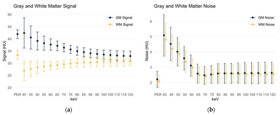 Signal and noise of gray and white matter. Data are depicted as mean ± standard deviation. GM: gray matter; WM: white matter; PER: polyenergetic reconstruction; HU: Hounsfield units. (a) Gray and white matter signal; (b) gray and white matter noise.