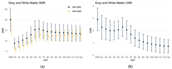 SNR and CNR of gray and white matter. Data are depicted as mean ± standard deviation. PER: polyenergetic reconstruction. (a) SNR of gray and white matter; (b) CNR of gray and white matter.