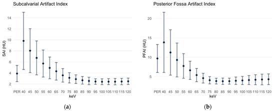 Subcalvarial and posterior fossa artifact indices. Data are depicted as mean ± standard deviation. PER: polyenergetic reconstruction. (a) SAI: subcalvarial artifact index; (b) PFAI: posterior fossa artifact index.