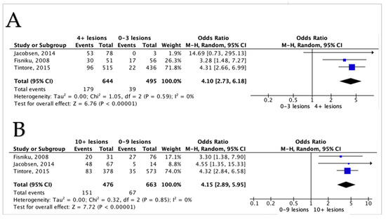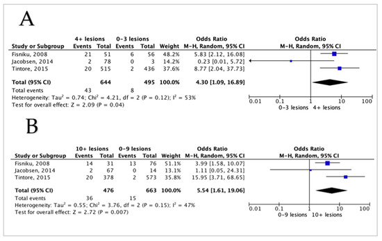 Forest plot demonstrating the odds of EDSS 3 with comparisons between different lesion counts (A,B); (A) a comparison between 0–3 lesions versus 4 or more lesions, (B) a comparison between lesions of 0–9 lesions versus 10 or more lesions. CI = confidence interval, I2 = heterogeneity index, df = degree of freedom.