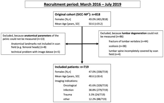 This study was approved by the institutional review board of the Charité—Universitätsmedizin Berlin (EA1/300/19) and conducted in accordance with local legislation and ethical standards as well as the Declaration of Helsinki. The investigation is a secondary analysis of a larger cohort of patients from the normal population without low back pain—detailed information on this cohort can be found in a separate publication []. A flow diagram of the assembly process of the study participants is given as Figure 1. Electronic patient records were searched for age, gender, nutritional status (slim, normal, obese), and parity (in women), as well as indication for the CT examination (oncological staging, search for infectious focus, trauma, bleeding, among others). To rule out identification of individual patients, all CT and demographic patient data were anonymized using a dedicated software.
