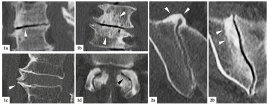 Imaging examples. (1): Degenerative lesions of the lumbar spine; (1a) = sagittal reconstruction: white arrowhead marks discal vacuum phenomenon and narrowing of intervertebral space; (1b) = coronal reconstruction: white arrowheads mark sclerosis of endplates; (1c) = sagittal reconstruction: white arrowhead indicates spondylophyte; (1d) = axial reconstruction: black arrowhead marks intraarticular vacuum phenomenon. Additionally, note the extensive sclerosis and joint space irregularities from OA of the facet joints. (2): degenerative lesions of the SIJ; (2a) = axial reconstruction: ventrally located, bridging osteophytes of the right SIJ marked with white arrowheads; (2b) = oblique-coronal reconstruction: extensive sclerosis around the joint (white arrowheads).