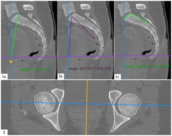 Anatomical measurements. (1a): Pelvic radius; distance between posterior–superior corner of the first sacral vertebra and the center of a line between the femoral heads (intersection between blue and violet lines). (1b): Pelvic incidence; angle between a line from the center of a line between the two femoral heads and the center of the sacral plateau and a line perpendicular to the sacral plateau. (1c): Sacral table angle; angle between the posterior wall of the sacrum and the sacral plateau. (2): Second plane (axial) to aid orientation.