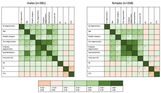 Correlations between SIJ degeneration, age, weight, disc degeneration, endplate degeneration, spondylophytes, facet joint OA, PR, PI and STA were investigated using Kendall-tau-b—a graphical representation of the resulting correlation coefficients is given as Figure 4. This graphic reveals differences in the association patterns between males and females, with a slightly stronger inter-relatedness of different forms of lumbar degeneration in females than in males, yet a lack of associations of degenerative lesions of the lumbar spine and SIJ degeneration in females. Some inter-relatedness of fixed anatomical markers is observed (e.g., a weak-to-moderate negative correlation between PI and STA in both sexes), but no significant correlation with either SIJ or lumbar spine degeneration is seen.