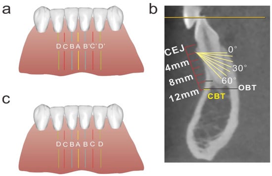 Figure 1. Schematic diagram of measuring method. (a) Seven insertion locations, A: the section bisecting the distance between two lower central incisors; B: labial to the middle of right central incisor; C: the section bisecting the distance between the right central and lateral incisors; D: labial to the middle of right lateral incisor; B’, C’, D’ represent the contralateral sites of B, C, D respectively. (b) Measurements of overall bone thickness (OBT) and cortical bone thickness (CBT) at different insertion heights and angles. (c) Four insertion locations after left- and right-side data were combined.