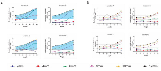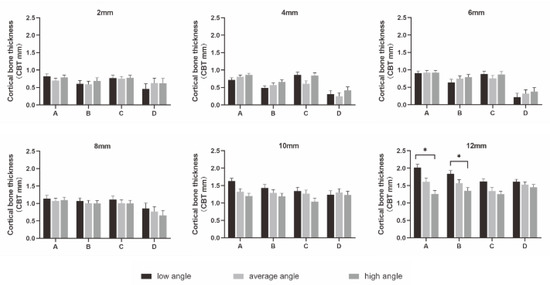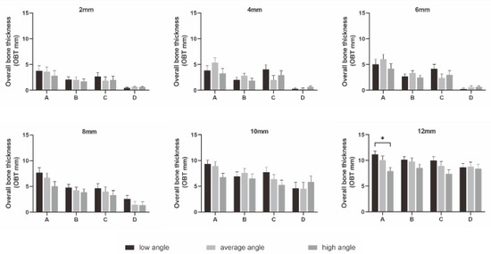 As displayed in Figure 2, OBT was significantly thicker in the low-angle cases than in average- and high-angle cases at the insertion height of 12 mm at location A (p < 0.05). Moreover, similar results were found for CBT at location A and B (both p < 0.05) (Figure 3).