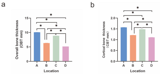 Figure 4. Comparisons of OBT and CBT among investigated locations. (a) Comparison of OBT among four insertion locations. * p < 0.05. (b) Comparison of CBT among four insertion locations. * p < 0.05.