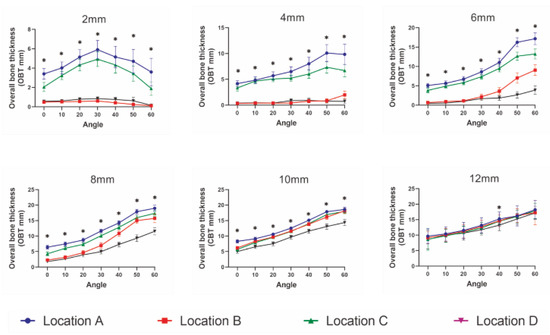 Figure 5. Comparison of the overall bone thickness (OBT) among four insertion locations at each insertion height. * p < 0.05, statistical significance among four sites.