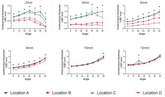 Figure 6. Comparison of the cortical bone thickness (CBT) among four insertion locations at each insertion height. * p < 0.05, statistical significance among four sites.