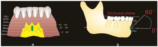 The stability of orthodontic mini implants is influenced by several factors [20,21,22]. In particular, insertion depth and cortical thickness are of vital importance [23,24]. A great body of evidence reveals that mini implants are stable with an adequate insertion depth and appropriate cortical thickness [25,26]. It is well-documented that mini implants are stable if the insertion depth is greater than 5 mm [27]. Interestingly, theoretically speaking, mini implants could be more stable with greater cortical thickness. However, cortical fracture may happen during the insertion of a mini implant if cortical thickness is greater than 2 mm, rendering a cortical thickness of 1–2 mm appropriate for the insertion of mini implants [28]. Thus, we mapped the yellow areas with the following requirements: OBT greater than 5 mm and CBT of 1–2 mm (Figure 8a). In the yellow area, there is a trade-off relationship between the insertion height and insertion angle. Specifically, the insertion angle should be larger if the insertion height is lower, e.g., insertion angulation was 45–60 degrees at a height of 4–6 mm, but 0–60 degrees at a height of 12 mm. However, soft tissue inflammation is very likely if the insertion is too apical. On the other hand, mini implant slippage is more likely if the insertion angle is too large. Thus, clinicians should choose a not-too-apical insertion site in the yellow area, where soft tissue inflammation and slippage of mini implants are less likely to happen.