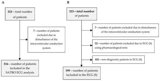 The diagnostic efficiency of SATRO ECG compared to resting-exercise SPECT was determined on a group of 316 patients (219 men and 97 women); the patient flow is shown in Figure 1A. Seven patients with conduction disturbances that had an influence on the parameters of the resultant potential measured on the thoracic surface were excluded; these were analyzed and described in the paper [22]. Changes in the parameters of the QRS complex are also a consequence of the ICS influence on the parameters of partial potentials during the depolarization of individual HM regions.