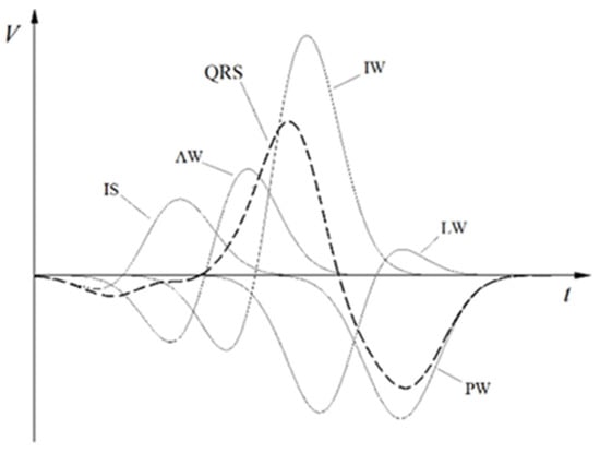where and denote the beginning and end of the appearing potentials with a cut-off point of . Each of the part potentials is defined by two functions: corresponding to the depolarization of a specific area of the left ventricular muscle, as shown in Figure 2., where are the parameters calculated for part potentials treated as the norm with normal electrical activity [3,16].