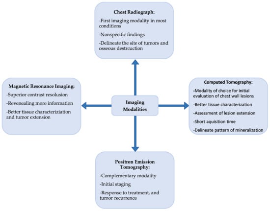 Chest radiography is usually the first imaging modality performed when chest wall lesions are clinically suspected, although it can provide some nonspecific information [4]. More specific cross-sectional modalities such as computed tomography (CT) and magnetic resonance imaging (MRI) are warranted for better tissue characterization and assessment of lesion extension [2]. Obtaining high-resolution images as well as a short acquisition time makes CT the modality of choice for the initial evaluation of chest wall lesions. Although CT is more precise in assessing bone lesions, MRI has a superior contrast resolution, revealing more details regarding tissue characterization and tumor extension [2,4,6]. 18F-Fluorodeoxyglucose positron emission tomography/computed tomography (18F-FDG PET/CT) is another complementary modality beneficial in initial staging, evaluation of response to treatment, and tumor recurrence [2,13].