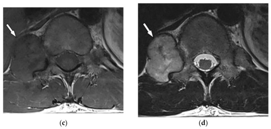 On CT, Ewing sarcoma appears as a destructive paraspinal soft tissue mass with internal necrosis and hemorrhage. Calcification is rarely reported, and the soft tissue component is usually larger than the osseous component [11]. It appears iso to hyperintense on T1-weighted and heterogeneous to hyperintense on T2-weighted MRI sequences. Intense homogenous or heterogeneous post-contrast enhancement is expected. Extraosseous Ewing sarcoma, usually seen in older patients, manifests as a large non-calcified mass within the paravertebral location (Figure 4) [17]. 18F-FDG PET/CT is a valuable complementary tool enabling accurate identification of adjacent invasion and distant metastasis [18,19].