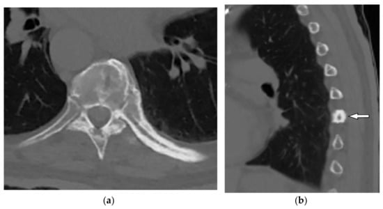 A 53-year-old woman with localized chest wall tenderness. The axial non-contrast CT in the bone window (a) and sagittal (b) images show enlarged vertebral body associated with trabecular coarsening, osseous expansion, and thickened cortex of right eighth rib (arrow).
