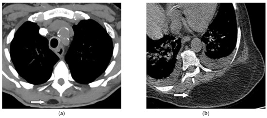 - Mullan, C.P.; Madan, R.; Trotman-Dickenson, B.; Qian, X.; Jacobson, F.L.; Hunsaker, A. Radiology of chest wall masses. Am. J. Roentgenol. 2011, 197, W460–W470. [Google Scholar] [CrossRef] [PubMed]