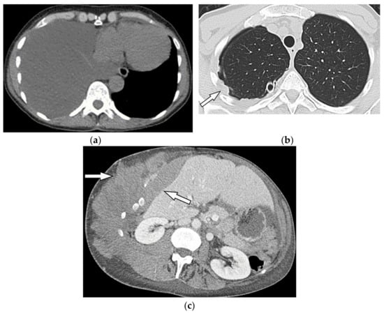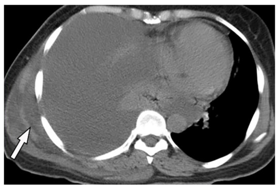 A 70-year-old man with dyspnea. The non-contrast CT in the axial plane demonstrates right-sided large pleural effusion, near complete collapse of the right lung (a) after the chest tube insertion; thick circumferential nodular pleural thickening of parietal pleura was shown (arrow) (b). Contrast-enhanced CT of the upper abdomen shows the extension of mesothelioma through the abdominal cavity and wall with indentation over adjacent liver parenchyma (arrow) (c).