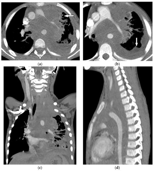 A 5-year-old girl with dyspnea. The axial contrast-enhanced CT in soft tissue window was obtained at the level of the main pulmonary artery (a,b), showing a large infiltrative soft tissue mass (arrow) with irregular border and slight enhancement encasing great mediastinal vessels. Left-sided pleural effusion was also identified. Coronal (c) and sagittal (d) CT better delineate the extension of the tumor and demonstrates infiltrative soft tissue mass within the superior, mid, and posterior mediastinum extending to the thoracic inlet and neck.