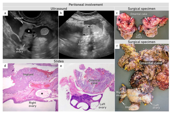 Peritoneal involvement. Ultrasound images in transverse plane demonstrating (a) peritoneal visceral implant on the right ovary and (b) omental infracolic cake extending on the visceral surface of the left ovary and uterine fundus. (c) Surgical specimen showing infracolic omentum densely adherent to the left ovary. (d) Microscopic specimen (H&E, 40×) showing tumor implant secondarily infiltrating the cortex of the right ovary; the dashed line shows the boundary between the superficial tumor implant and the ovarian cortex. (e) Omental cake is adherent to the surface of the left ovary on histotopogram without any neoplastic involvement of the ovary itself; the dashed line shows the boundary of the infracolic omental cake in adhesions to the left ovarian surface. (f) Surgical specimen of uterus and ovaries. See also Supplementary Video S1. * Follicular cyst found on the ultrasound examination (a) and in microscopic specimen (d).