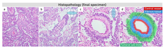 Histopathology (final specimen). The specimens (a,b) at 200× g magnification demonstrate (a) papillary pattern combined with small tubopapillary endodermal sinus structure (Schiller–Duval body) in blue circle; (b) marked tubulopapillary sinusoidal structure with central vascular core in longitudinal section (Schiller–Duval body); (c,d) 400× g magnified image plus zoom of diagnostic round cystic Schiller–Duval body in a transverse section, with microcystic and papillary patterns around. The body has a central vessel surrounded by fibrous tissue, called the fibrovascular core, and it is surrounded by layers of the tumoral cells at the surface of that stalk. The structure is located in open cystic space also lined by tumoral cells. All those structures together are called a Schiller–Duval body and resemble primitive glomerulus.