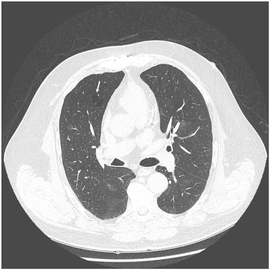 The chest X-ray showed linear opacities in the lower right lobe due to atelectasis, comparable to the previous examination results. The high-resolution computed tomography confirmed emphysema features and revealed thickening of bronchial walls with secretions accumulation and slight post-inflammatory changes (Figure 1 and Figure 2). No features of bronchiectasis nor enlarged lymph nodes in mediastinum and hilar space were present, and no fluid signs in the pleura.