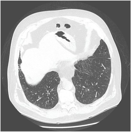 HRCT scan—Secretions accumulation and slight post-inflammatory changes (indicated by the white arrows).