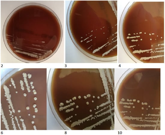 The growth of tiny creamy-yellowish colonies observed on Columbia blood agar plates (2, 3, 4, 6, 8, 10 days of incubation).