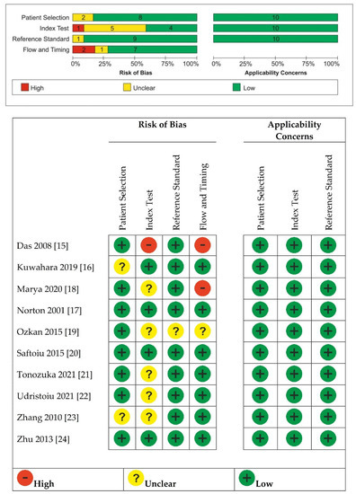 Das 2008 [17] and Marya 2020 [20] were considered having high risk of bias for flow and timing because not all patients received the same reference standard.