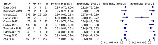 Pooled sensitivity and specificity, DOR with their 95% confidence intervals, and AUC with partial AUC are summarized in Table 2, with data stratified into several subgroups. All ten studies with 1871 patients were merged to derive pooled diagnostic test accuracy. The overall diagnostic accuracy showed 0.92 (95% CI, 0.89–0.95) sensitivity and 0.9 (95% CI, 0.83–0.94) specificity.