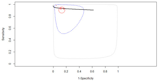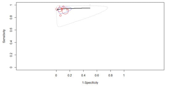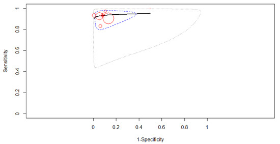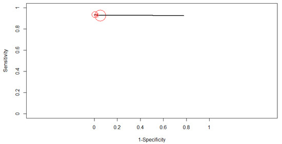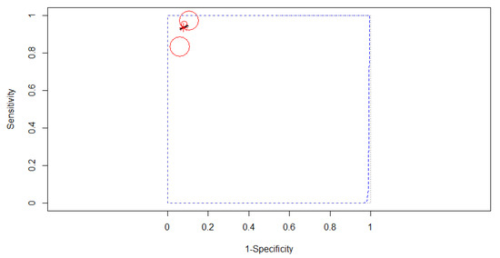 Two studies reporting data on 604 patients were included in the analysis, as in Figure 9. The SROC curve estimated mean (sensitivity, false positive rate): (0.93, 0.02). No 95% confidence contour or prediction contour was drawn because of the small number of included studies. Since no heterogeneity was identified in our meta-analysis (Tau2 = 1.783, I2 = 0%), a fixed-effects model was applied for the pooled analysis. The pooled sensitivity was 0.93 (95% CI, 0.89–0.96). The pooled specificity was 0.98 (95% CI, 0.85–0.99), the specificities of the two studies being significantly different (χ2 = 4.486, p-value = 0.034). A high AUC was estimated: 0.93, almost the same as the partial AUC (0.92).