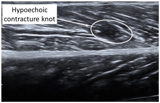 Over the years, the terms “contracture knot” and “TrP” have been used interchangeably [22,23]. This lack of clarity in objective definition of these two terms has led to unnecessary communication difficulties among clinicians and researchers. Hong proposed that the sensorimotor abnormalities of TrPs are related to multiple sensitized afferent nerves [24] and motor endplates [25] contained within the “TrP region,” or what clinicians define as a palpable “contracture knot”. Meng et al. identified an increased number of afferent nerve fibers in the “TrP region” compared to normal muscle tissue and concluded that proliferation of afferent nerve fibers plays a significant role in TrP pathophysiology [26]. Recent studies on animal models support the idea that contracture knots are collections of smaller TrPs located at the neuromuscular junctions [27], but this phenomenon has not been visualized to date with US. An old previous attempt at US of TrPs failed to reliably identify contracture knots due to limitations in the imaging technology at the time of the study [28]. In the following years, advancements in the technology of the ultrasound probe and computerized imaging processing have resulted in dramatic advancements in image quality [29,30]. In fact, a recent study used US imaging for assessing the intensity of the LTR during the application of dry needling [31]; however, this study failed to visualize the TrP area itself under US.