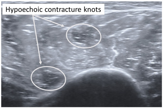 Ultrasound imaging assessment of the right deltoid muscle showing two palpable contracture knots as hypoechoic (hyperperfused) areas.