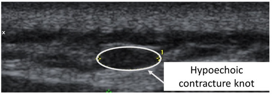 Ultrasound imaging assessment of the right gastrocnemius muscle showing the palpable contracture knot as a hypoechoic (hyperperfused) area.